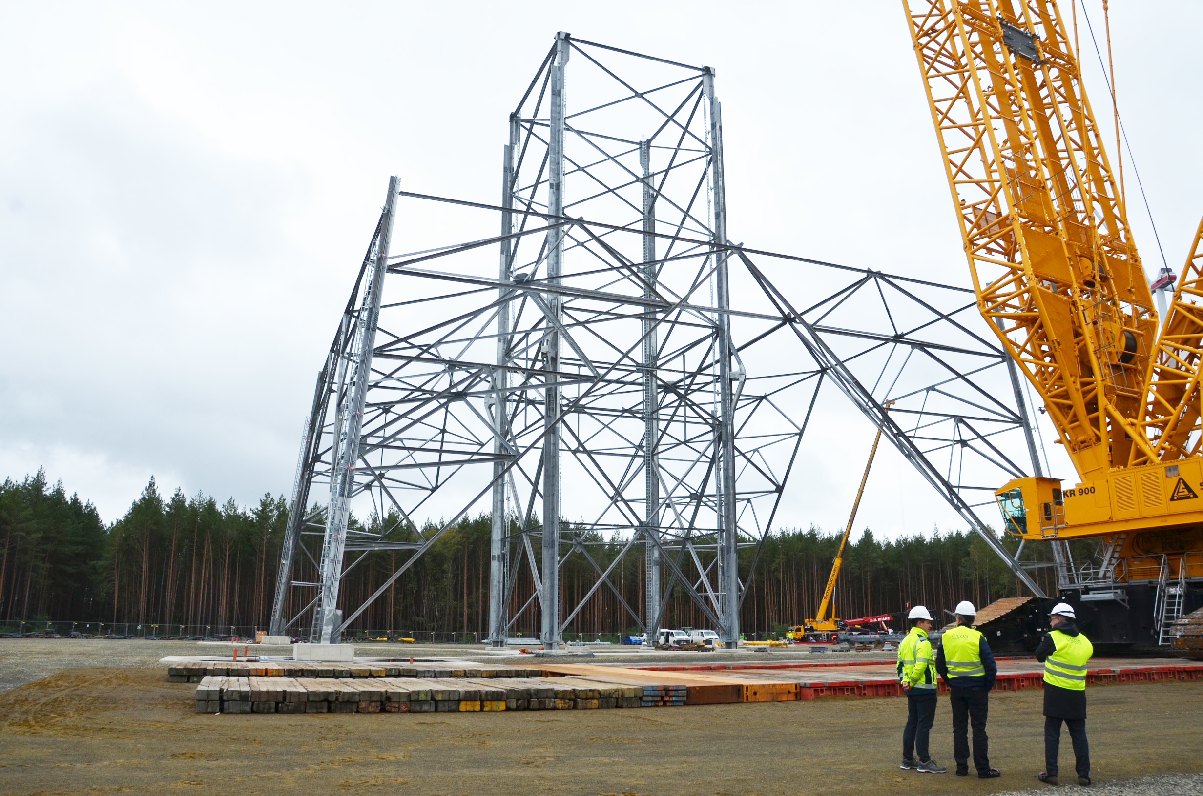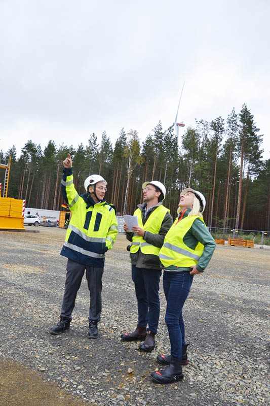 Antje Frank schlüpft in eine Sicherheitsweste und setzt sich einen Helm auf. Neben Großmann spaziert sie auf den entstehenden Giganten zu. Die Versicherungsfrau blickt nach oben auf den Außenturm, der dem Standbein eines Hochspannungsmasts gleicht. Darin erhebt sich der Innenturm. Immer abwechselnd wachsen beide um 25 Meter. Die Rotoren der beiden Windräder, die sich in einiger Entfernung träge über den Wipfeln der Kiefern drehen, wirken im Vergleich zu dem, was sich hier bald in den Himmel recken wird, fast wie Spielzeug. Dabei, so Großmann, habe man die Grundfläche des Riesenwindrads mit 48 Metern von Ecke zu Ecke so klein gehalten wie nur möglich, um Material zu sparen.