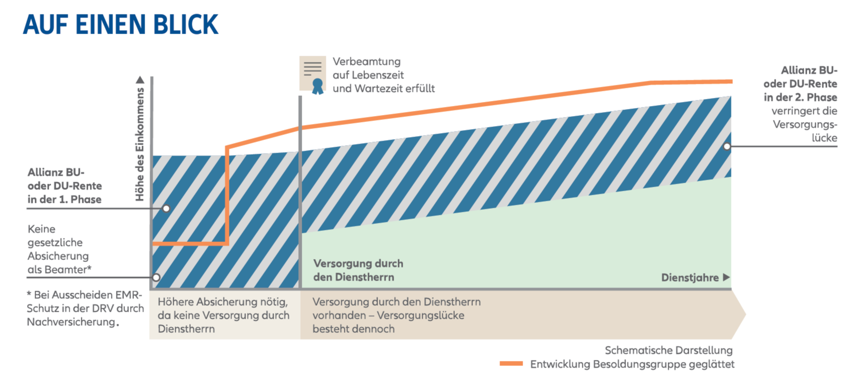 Vor allem zu Beginn des Beamtenverhältnisses reicht die staatliche Absicherung im Fall einer Dienstunfähigkeit meist nicht aus, um den gewohnten Lebensstandard zu halten. Die Berufs- und Dienstunfähigkeitsversicherung der Allianz berücksichtigt über zwei Phasen mit unterschiedlich abschließbaren Rentenhöhen den sich verändernden Absicherungsbedarf von Beamten und ermöglicht einen passenden Schutz.
